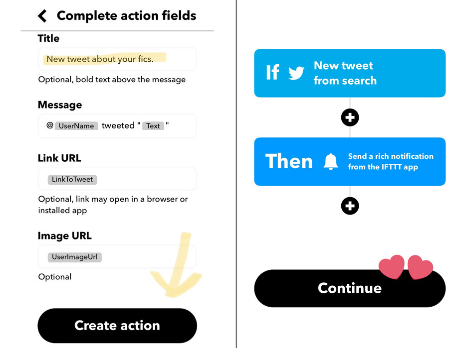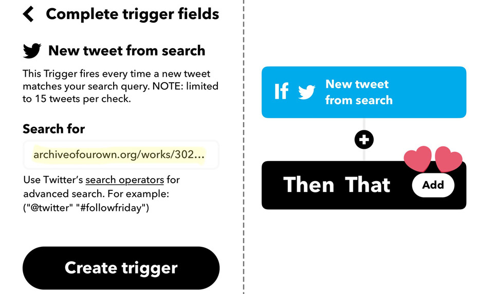 Do you enjoy pain? Want to get notified when someone tweets a link to your AO3 work?Install the free IFTTT app (If This, Then That). You can set the app to regularly search twitter for your fic URLs, and notify you whenever it finds a new post.**Full guide below ⤵️ **