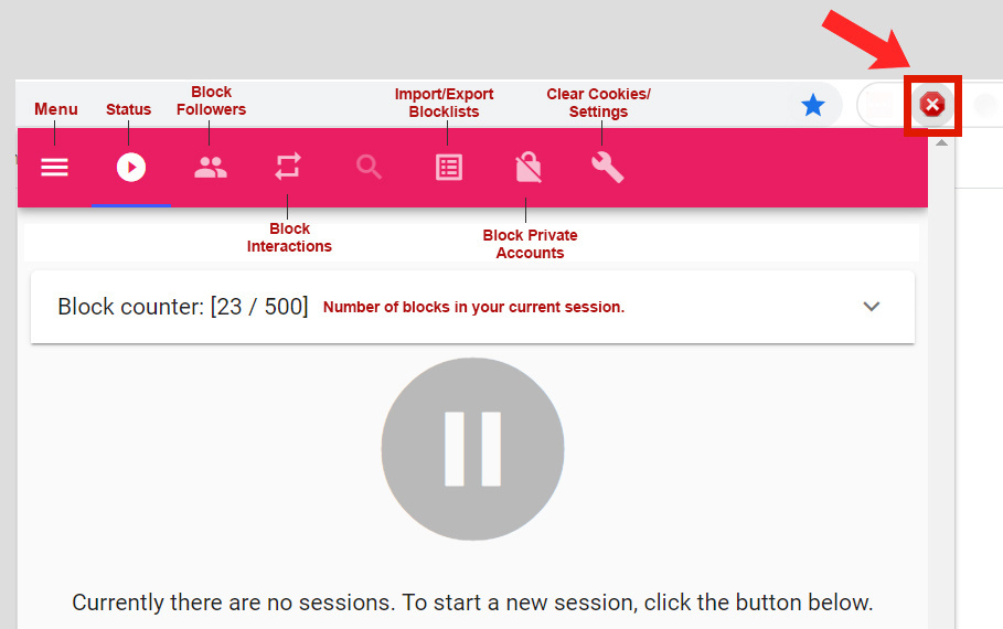 Click the red "X" icon in the upper-right corner of your browser to select a block mode: